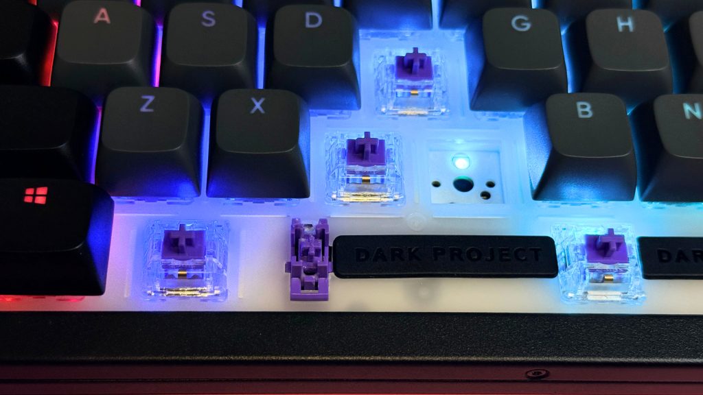 Najważniejsze nie są jednak liczby, tylko wrażenia pod palcem. Przede wszystkim transparentna obudowa przełącznika robi świetną robotę w połączeniu z podświetleniem. Diody nie przebijają się przez plastik na siłę, tylko równomiernie rozświetlają wnętrze, przez co RGB wygląda czyściej i efektowniej. Do tego dochodzi fabryczne smarowanie, klawisze poruszają się gładko, nie słychać suchych przeskoków ani chrobotania plastiku, które potrafią zniszczyć pierwsze wrażenie nawet w droższych konstrukcjach.