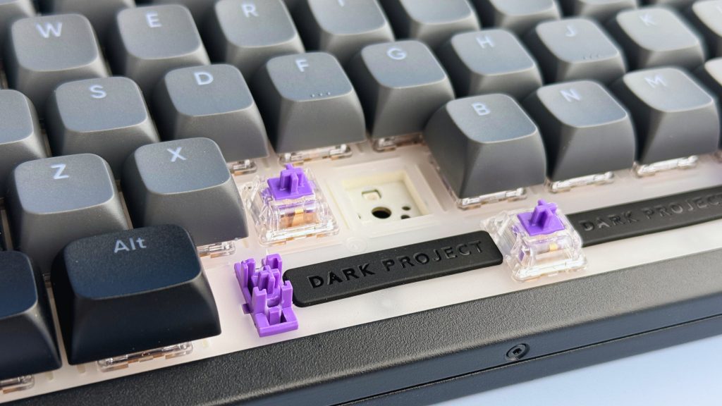 Na plus wypadają też dodatkowe przełączniki w zestawie. Dzięki nim możesz w kilka minut sprawdzić na żywo różnicę między Amethyst a innymi wariantami, założyć coś cięższego pod spację czy enter i zdecydować, czy jest sens kupować pełen komplet przełączników pod większy mod. Dokładnie do przetestowania dostajemy ultra cichy, liniowy g3ms Voidstone oraz taktylny g3ms Azure.