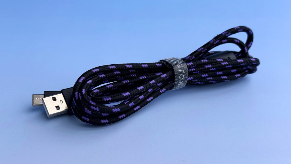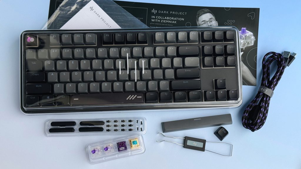 - kabel USB-A do USB-C o długości ~1,8 m, sensownie wykonany, w oplocie i dopasowany wizualnie (to drobiazg, ale przy czarnej klawiaturze i fioletowych akcentach całość wygląda spójnie),