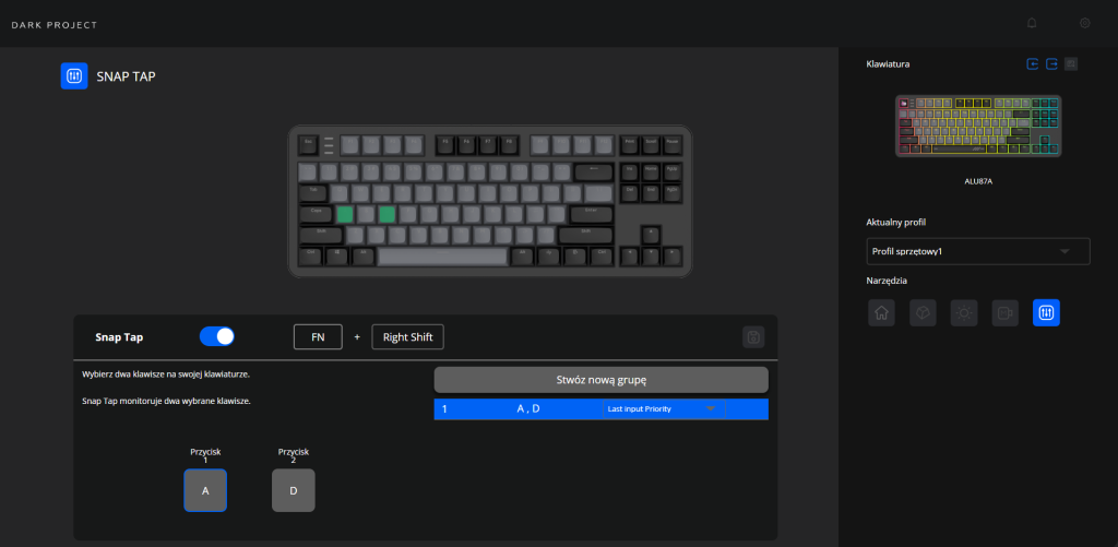 Jednym z ciekawszych dodatków jest funkcja Snap Tap, skierowana głównie do osób grających w dynamiczne gry, zwłaszcza FPS-y. W praktyce pomaga ona przy szybkich zmianach kierunku. Zamiast wymagać idealnie czystego zwolnienia jednego klawisza, klawiatura potrafi priorytetyzować ostatnie wciśnięcie, co zmniejsza efekt przyhamowania postaci przy niedokładnym sterowaniu.
