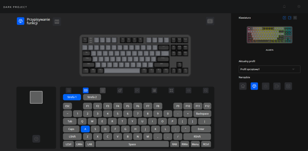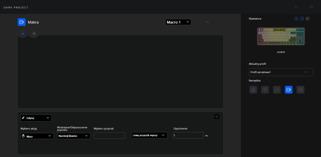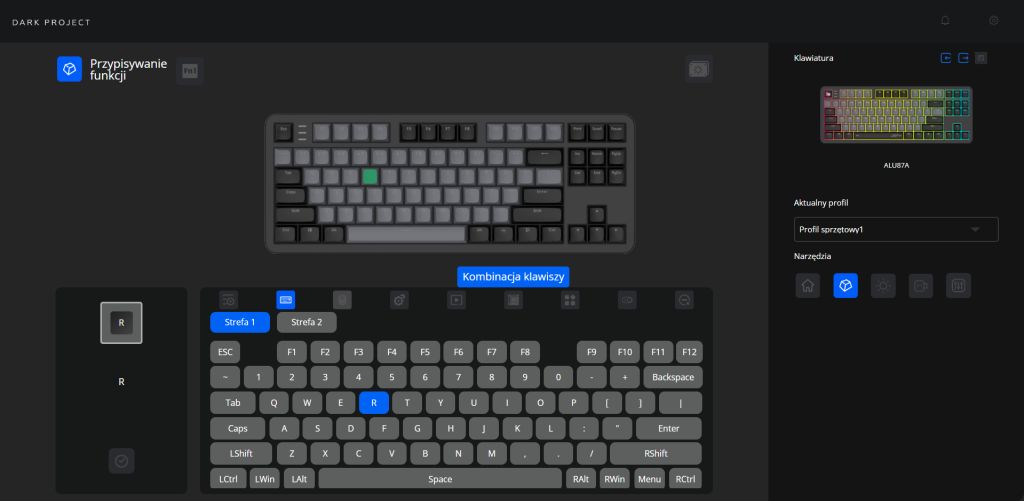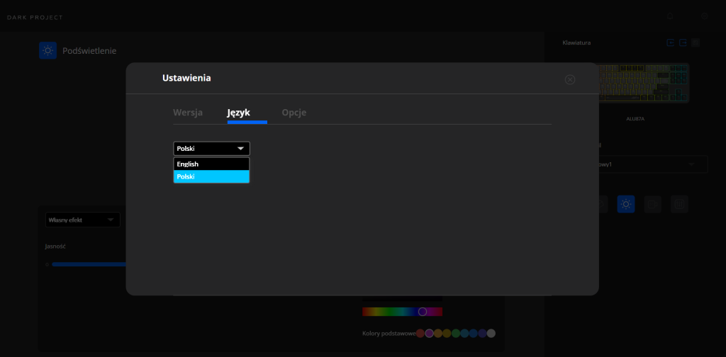Sam interfejs jest sensownie poukładany, osobne zakładki odpowiadają za mapowanie klawiszy, makra, konfigurację RGB czy funkcje stricte gamingowe. Nie trzeba przekopywać się przez pięć poziomów menu, żeby dotrzeć do podstawowych opcji. Dodatkowo do wyboru mamy język polski.