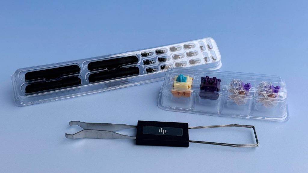 - dodatkowe przełączniki i co ważne, to nie jest tylko zapas na wypadek awarii. Dostajemy dwa przełączniki Amethyst oraz dwa inne do porównania, dzięki czemu możemy na własnych palcach sprawdzić różnice i np. zdecydować, czy pod spację albo enter nie wolimy innego charakteru pracy, zanim wydamy pieniądze na pełny komplet switchy,
