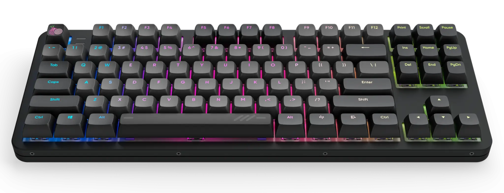 a do tego konstrukcję opartą na gasket-mount z wielowarstwowym wyciszeniem i fabrycznie smarowanymi stabilizatorami. Całość zamknięta jest w ciężkiej, aluminiowej obudowie, która dociąża klawiaturę do okolic 1300 gramów a to dużo jak na TKL, ale tutaj działa to na plus: klawiatura ani drgnie na biurku.
