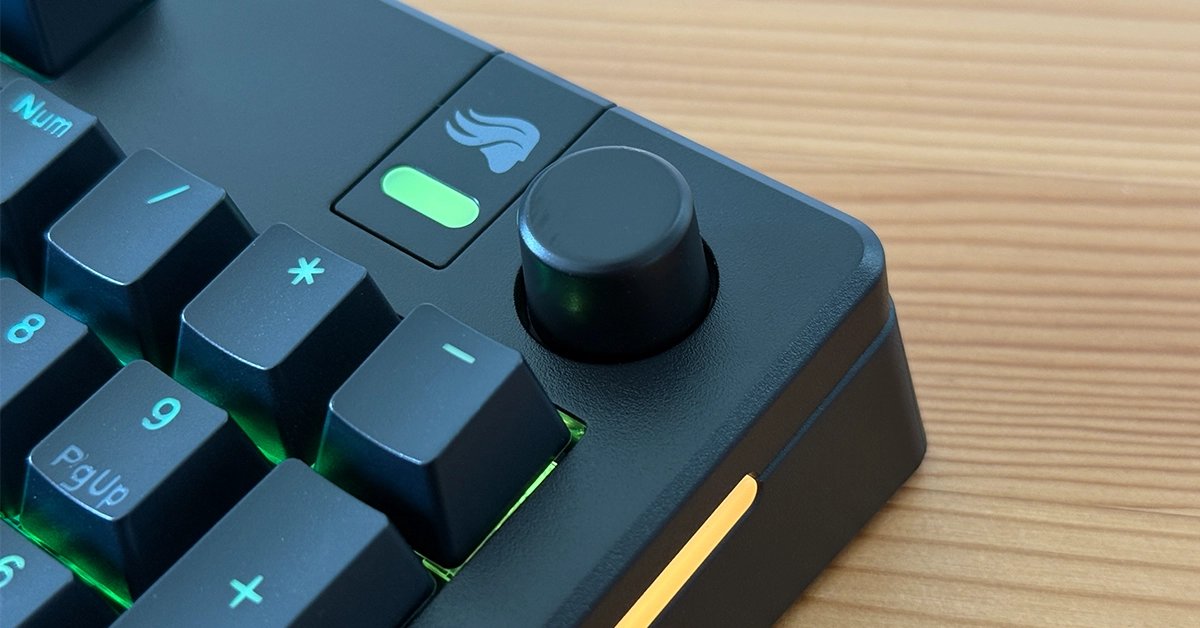Indywidualne podświetlenie każdego klawisza sprawia, że litery są czytelne nawet przy niskiej jasności, a grube nasadki GPBT w technologii „doubleshot” przepuszczają światło równomiernie, nie blakną i nie błyszczą się z czasem. Boczne listwy świetlne dodają dyskretnej poświaty na biurku, a oddzielna strefa przy emblemacie w prawym górnym rogu pozwala dołożyć kropkę nad „i” w wybranym motywie kolorystycznym. Tuż obok znajduje się programowalne pokrętło wielofunkcyjne, które jednym ruchem ścisza muzykę, reguluje jasność, przewija oś czasu w edytorze, a w grach może służyć choćby do szybkiej zmiany głośności czatu głosowego. Klik w gałkę działający jak natychmiastowe wyciszenie bywa pomocne.