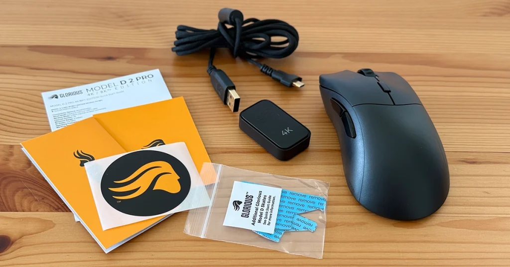Łączność 2,4 GHz pracuje stabilnie i bez dropów. Dongle 4K jest solidny. Bateria według producenta wytrzymuje około 80 godzin przy 1000 Hz. Podbicie odpytywania skraca czas pracy, więc trzeba znaleźć swój balans. Ślizgacze z PTFE zapewniają gładki poślizg na tkaninie i szkle. Nawet po kilku dniach intensywnego używania działają gładko i precyzyjnie.
