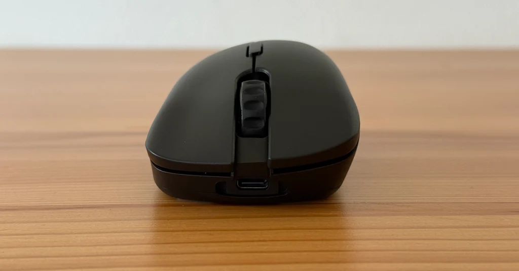 Obudowa jest gładka, bez perforacji i bez „gamingowego” podświetlenia. To świadomy wybór, który porządkuje estetykę. Z dołu widać diodę informującą o DPI, na górze obudowy tuż pod przyciskiem zmiany profili znajduje się druga mała dioda. Całość jest sztywna i nie ugina się pod naciskiem. Nic nie trzeszczy i nie stuka, nawet podczas intensywnych testów. W praktyce nic nie wpływa negatywnie na rozgrywkę. Matowa powłoka poprawia chwyt i nie zbiera odcisków. Czyszczenie zajmuje chwilę, a mysz długo wygląda świeżo.