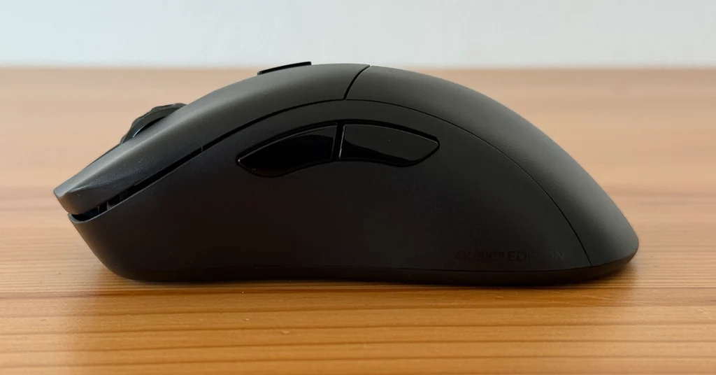 Kształt faworyzuje palm oraz claw grip, zwłaszcza przy średnich i dużych dłoniach. Hump stabilnie podpiera dłoń, lecz nie wymusza chwytu. Dłuższe sesje nie męczą ręki głównie za sprawą niewielkiej wagi. Coating jest delikatnie ziarnisty i „kredowy” w dotyku. Zapewnia pewny chwyt nawet, gdy dłoń lekko się poci. Dodatkowo nadruki są wtopione w materiał, więc spód pozostaje estetyczny.