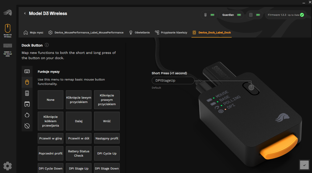 Tu dzieje się magia. Stacja Glorious pełni jednocześnie kilka ról. Ładuje akumulatory. Pokazuje poziom naładowania myszy i zapasowego ogniwa. Informuje o DPI oraz o bieżącym polling rate. Umożliwia też ich zmianę jednym przyciskiem. Co ważne, przycisk można przeprogramować w dedykowanym oprogramowaniu Glorious Core. Dzięki temu przydaje się również do multimediów.
