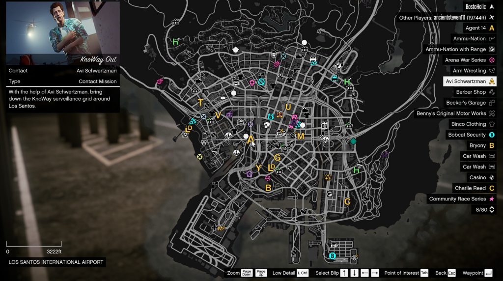 Po wybraniu i zakupie jednej z posiadłości możesz zwiedzić swój nowy dom lub od razu udać się do ikony „A” na mapie, która znajduje się w samym centrum Los Santos. Ikona „A” oznacza Avi Schwartzmana, który poprowadzi Cię przez pierwszy zestaw misji w „Safehouse in the Hills”.
