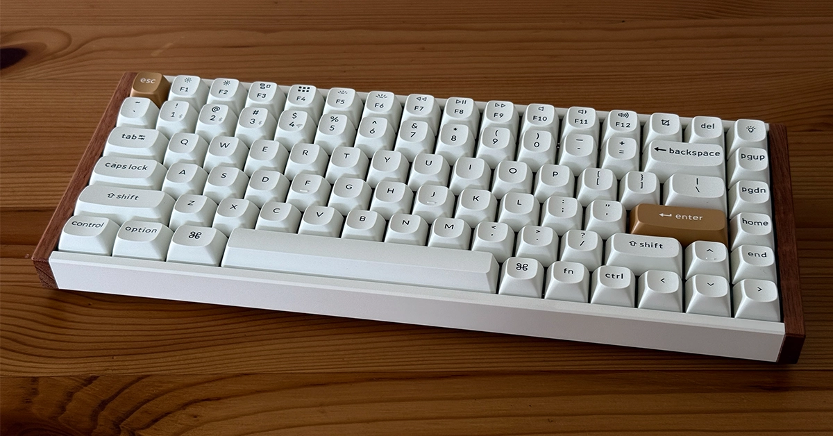 Keychron K2H-Q1 to konstrukcja 75% z 84 klawiszami. Format oszczędza miejsce, ale nie zabiera strzałek ani klastrów nawigacyjnych. Jest to wersja specjalna z drewnianymi panelami bocznymi. Bazuje na aluminiowych ramach oraz dolnej części z tworzywa. Waga wynosi około 965 g.