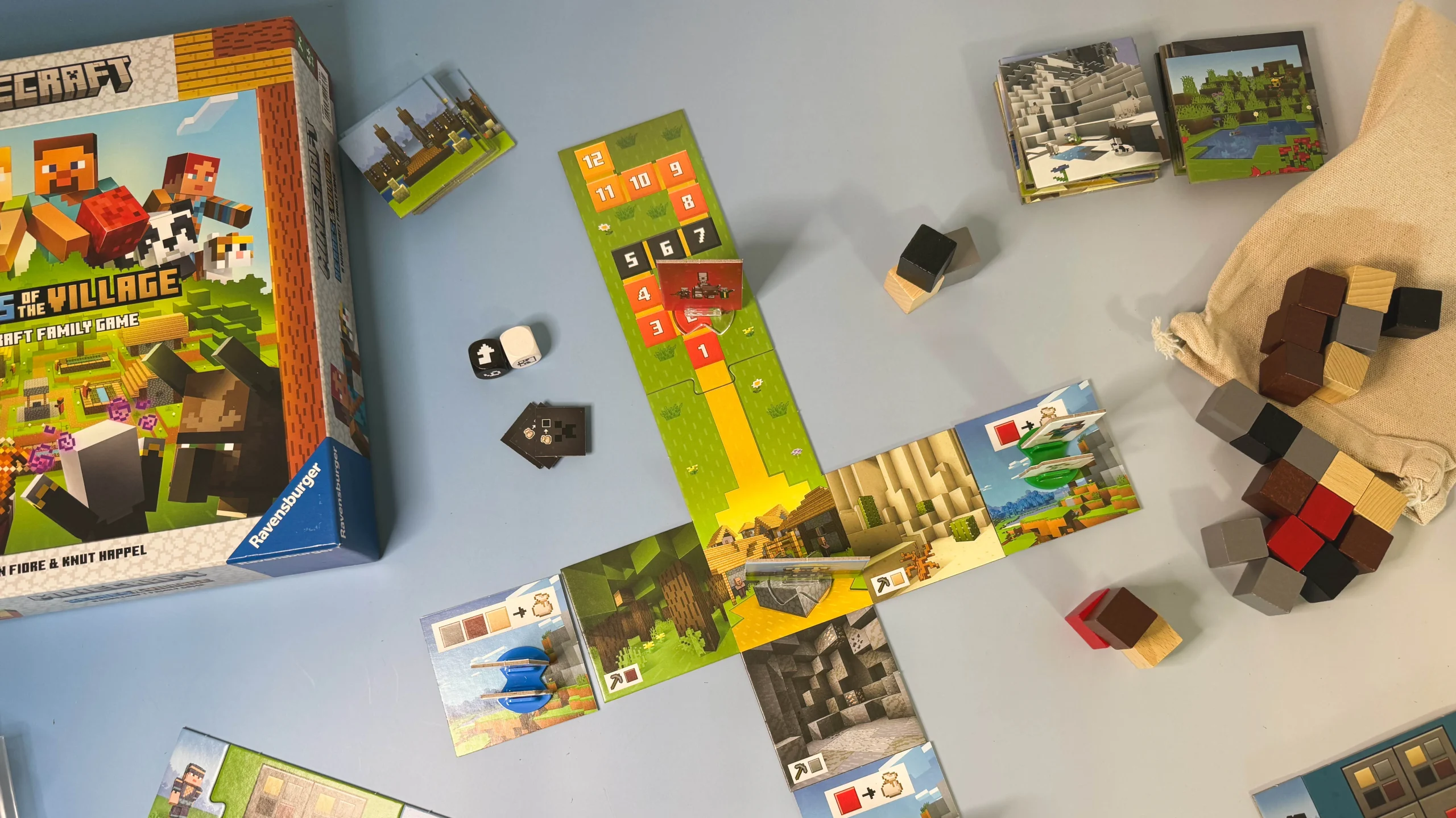 Pierwsze wrażenie po otwarciu pudełka to zachwyt nad jakością komponentów. W środku znajdziemy kolorowe kafle terenu, pionki postaci i ich zwierzaków, worek na zasoby oraz zestaw różnorodnych bloków do budowy wioski. Całość nawiązuje do charakterystycznego stylu Minecrafta – wszystko jest „pikselowe” i utrzymane w jasnych, wesołych kolorach.