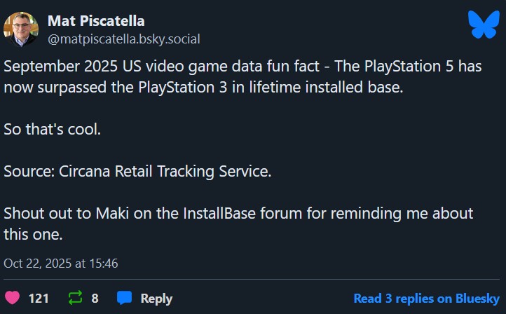 PlayStation 5 osiągnęło znaczący kamień milowy na rynku amerykańskim, wyprzedzając pod względem całkowitej sprzedaży egzemplarzy swoją poprzedniczkę, PlayStation 3. Jak poinformował Mat Piscatella z firmy analitycznej Circana (dawniej NPD), konsola obecnej generacji, która zadebiutowała w listopadzie 2020 roku, dokonała tego w niecałe pięć lat od premiery.