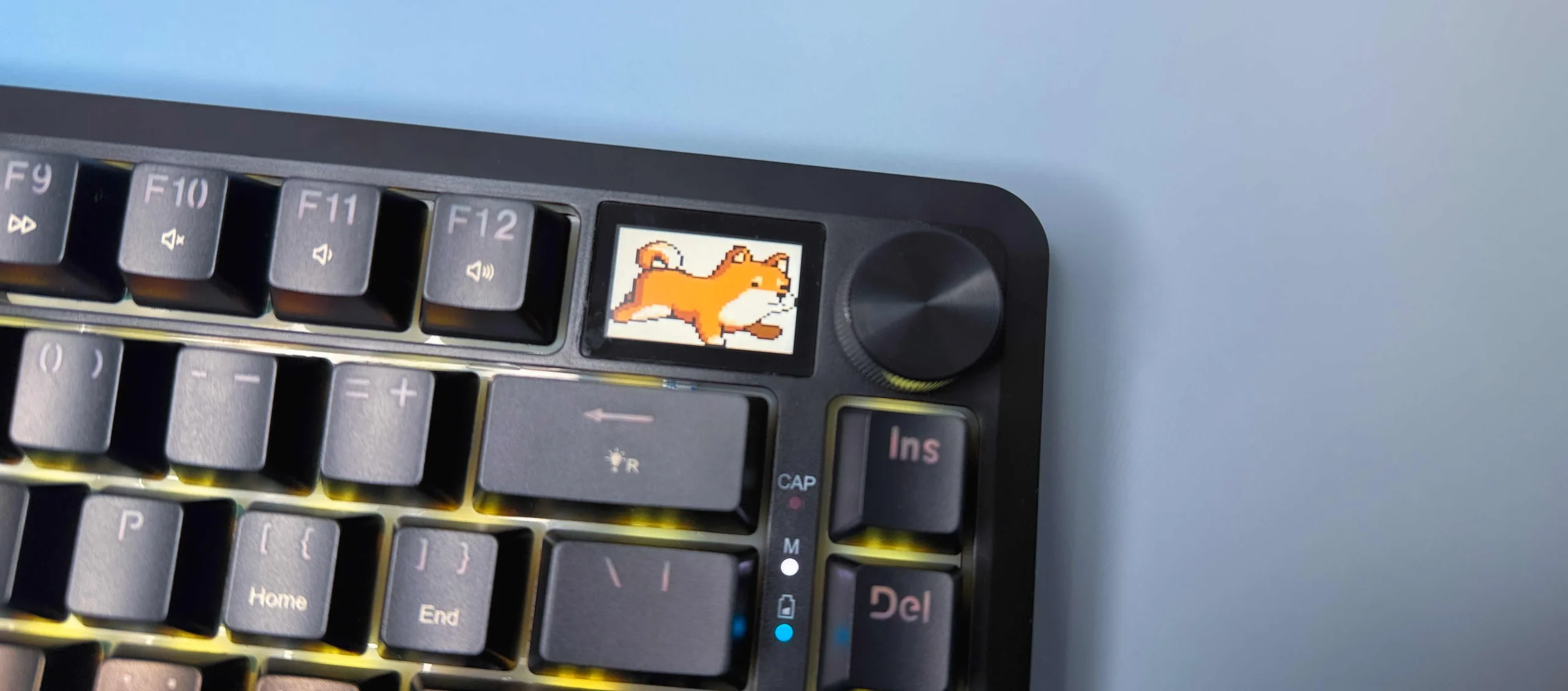 Domyślnie ekran pokazuje datę, godzinę, stan baterii i inne podstawowe informacje, takie jak aktywne profile czy blokada przycisku Windows. Ale to nie wszystko! Dzięki dedykowanemu pokrętłu możesz przełączać tryby wyświetlacza – od klasycznych danych systemowych po bardziej kreatywne opcje, jak wyświetlanie animowanych GIF-ów.