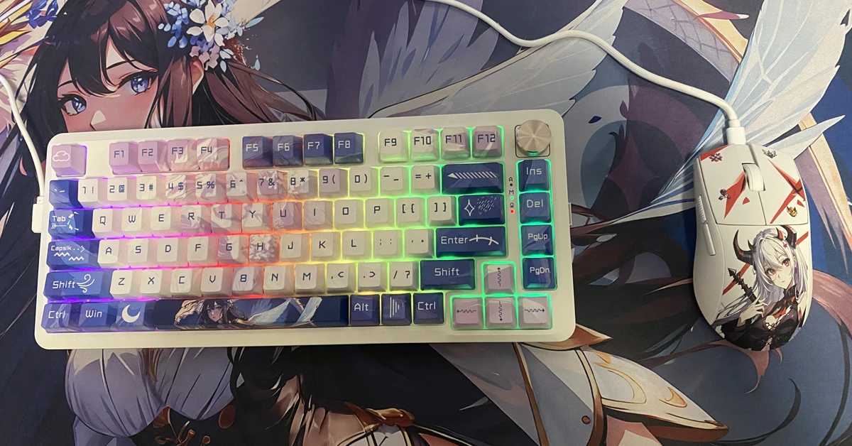 Pierwsze, co rzuca się w oczy, to niezwykle dopracowana kolorystyka – klawiatura utrzymana jest w odcieniach niebieskiego, fioletowego i białego, co nadaje jej wyjątkowego, niemal bajkowego wyglądu. Całość uzupełnia grafika inspirowana anime, która w połączeniu z dynamicznym podświetleniem RGB sprawia, że klawiatura prezentuje się niezwykle efektownie.