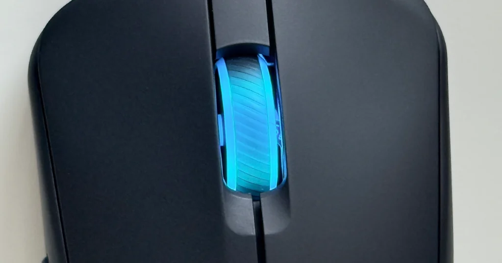 Wykończenie to drobnoziarnisty mat, który zapewnia suchy i stabilny chwyt. Spasowanie elementów jest równe: boczne przyciski siedzą w prowadnicach, a praktycznie bezgłośna rolka ma wyraźny, równy skok. Między rolką a przyciskami zostawiono niski skok, który wydłuża ruch.