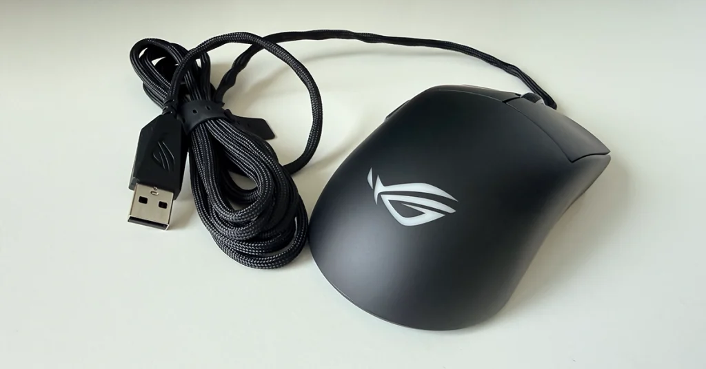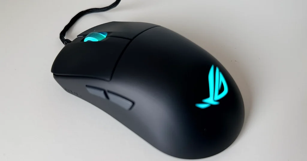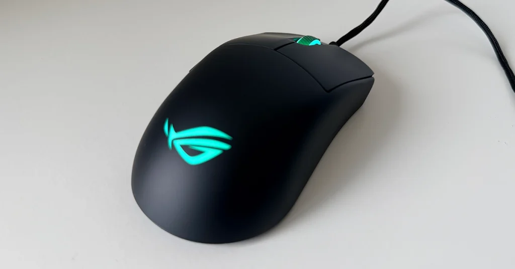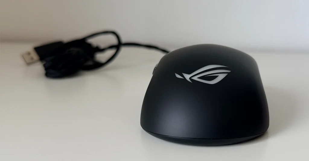 Estetycznie to „pro look”: czerwone logo ROG na grzbiecie i RGB na rolce robią lekki klimat, ale nie dominują na biurku. Brak dodatkowych diod, nic nie świeci po oczach przy nocnych gierkach. Detal, który robi różnicę w codziennym użyciu: przycisk zmiany DPI trafił pod spód. Góra zostaje czysta, a Ty nie wylądujesz przypadkiem na 3200 DPI w środku walki. Jeśli często bawisz się czułością „w locie”, będziesz musieć sięgnąć pod mysz, ale w zamian zyskujesz bezbłędny, minimalistyczny top.