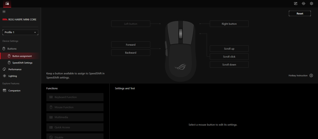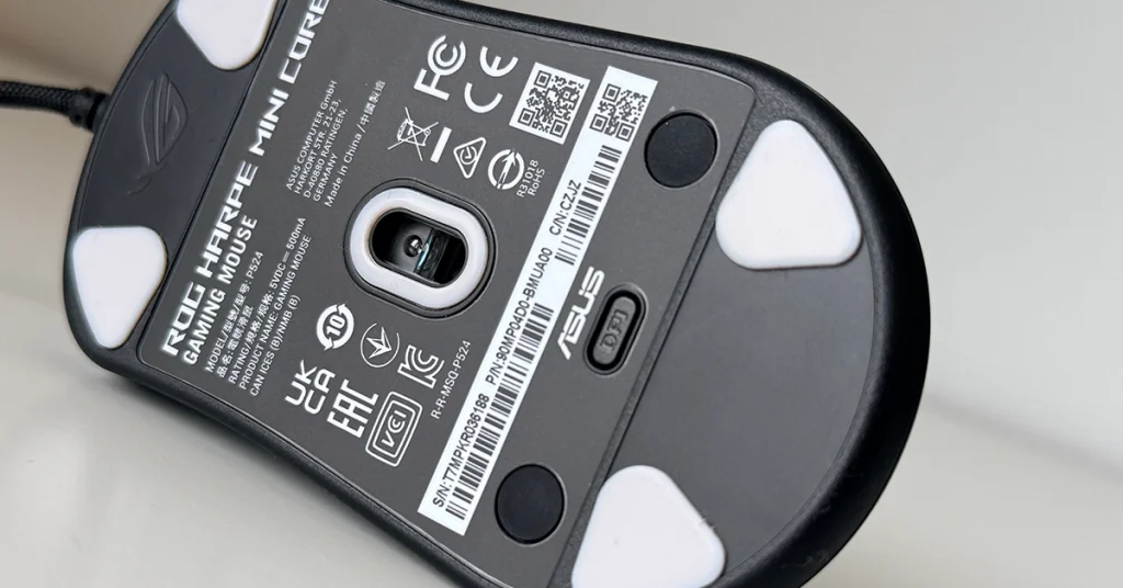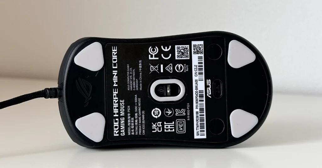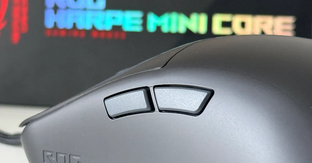 Harpe Mini Core waży około 52 gramów i jest jak sama nazwa wskazuje, mini (117 × 63 × 37 mm). Sercem jest sensor 12 000 DPI, który radzi sobie z prędkością do 300 IPS oraz przeciążeniem 35G. Polling rate 1000 Hz, ślizgacze z czystego PTFE i bardzo (serio bardzo) miękki przewód, niestety przymocowany na stałe. W głównych przyciskach siedzą ROG Micro Switch II o deklarowanej żywotności 100 milionów klików, a dzięki gniazdom Push-Fit możesz je później zmienić bez lutownicy. Brzmi “normalnie”? I dobrze. W graniu normalność oznacza przewidywalność.
