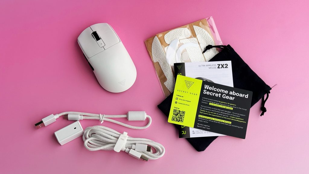 Zawartość opakowania: mysz ZX2, kabel USB-C 1,6 m, kabel USB-C 20 cm, nadajnik 2,4 GHz 8K, zapasowe ślizgacze PTFE, taśmy antypoślizgowe na myszkę, aksamitny woreczek, instrukcja.