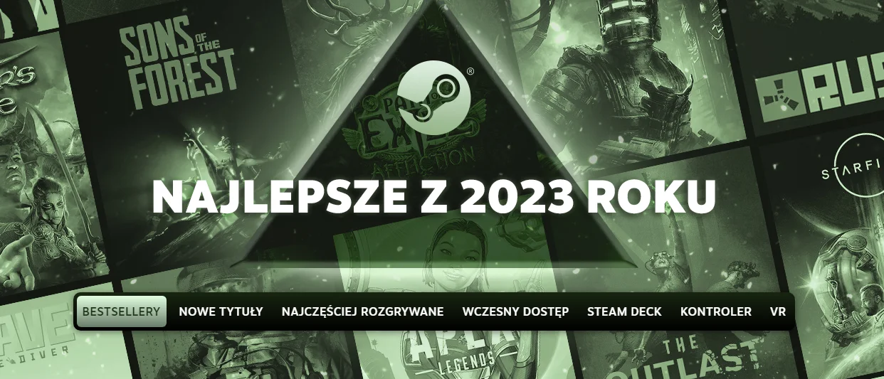Bestsellery 2023 roku: 1. Starfield2. Destiny 23. PUBG Battlegrounds4. Apex: Legends5. Hogwarts Legacy6. Lost Ark7. Baldur’s Gate 38. Call of Duty: Modern Warfare 39. Cyberpunk 207710. Counter Strike 211. Sons of the Forest12. Dota 2